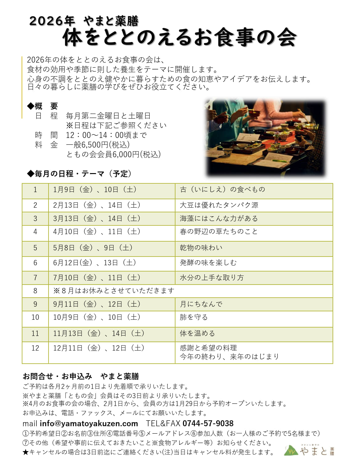 やまと薬膳では、ご自分の体に合う食事の発見や体のケアをしていただく機会として、毎月「体をととのえるお食事の会」を開催しています。ぜひお気軽に食べにきていただき自分に合った食事で元気を取り戻してください。
